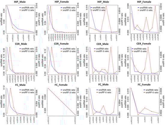 Similar analysis of the reads mapping to snoRFs and snoRNAs showed that snoRF-3 stemming from snoRD116 were enriched in both male and female CER and FC as well as in female HIP but not in male HIP (Figure 6). Among snoRF-5 reads, those stemming from snoRA54 were enriched in all male and female brain regions, although enrichment in FC in females was less pronounced. Additionally, snoRF-5 reads mapping to snoRA-3 were enriched in female HIP and male FC. Again, this experiment showed that certain snoRNAs are processed more frequently and at different rates in different brain regions.