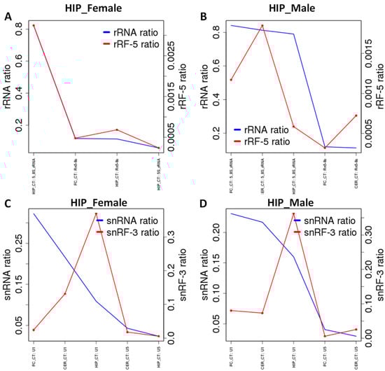 rRF and snRF enrichment from rRNA and snRNA in various brain regions. (A) rRNA and rRF ratios for female hippocampus; (B) rRNA and rRF ratios for male hippocampus; (C) snRNA and snRF ratios for female hippocampus; (D) snRNA and snRF ratios for male hippocampus. The Y-axis shows reads mapping to rRFs and snRFs or rRF-5 and snRF-3. When the rRFs and snRFs peaks are larger than rRNA and snRNA peaks, there is an enrichment, while when it is lower, there is underrepresentation.