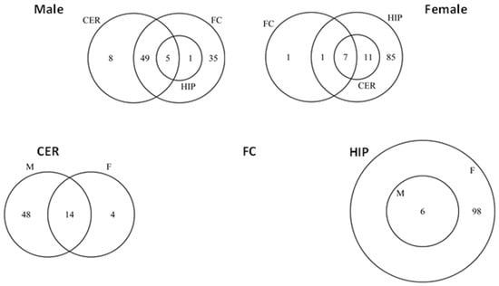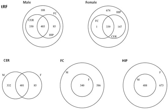 We used miRDB to predict unique gene targets of ncRFs. We first compared unique and common targets for tRFs among different regions in males (Supplementary File S1). We found 926 target genes in male FC, 733 target genes in CER, and 488 in HIP; CER and HIP groups overlapped fully with the FC group (Figure 8). Comparison of male to female groups showed that for FC and HIP, there was a full overlap between males and females; in contrast, in CER, there also was a large overlap between males and females, but there were 332 unique target genes in males and 85 in females. Among uniquely targeted genes in females were PLAGL1, Tmem35, STRN3, and many other neuron-related genes (Supplementary File S1). In male CER, tRF targeted Ganglioside-induced differentiation-associated-protein 2 (Gdap2), cholinergic receptor muscarinic 1 (Chrm1), glutamate receptor metabotropic 8 (Grm8), glial cell-derived neurotrophic factor (Gdnf), glutamate receptor ionotropic delta 2 (Grid2), olfactory receptor 1587 (Olr1587), and many other brain-specific factors.