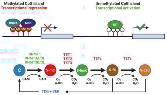 - Shen, L.; Wu, H.; Diep, D.; Yamaguchi, S.; D’Alessio, A.C.; Fung, H.L.; Zhang, K.; Zhang, Y. Genome-Wide Analysis Reveals TET- and TDG-Dependent 5-Methylcytosine Oxidation Dynamics. Cell 2013, 153, 692–706. [Google Scholar] [CrossRef] [PubMed] [Green Version]