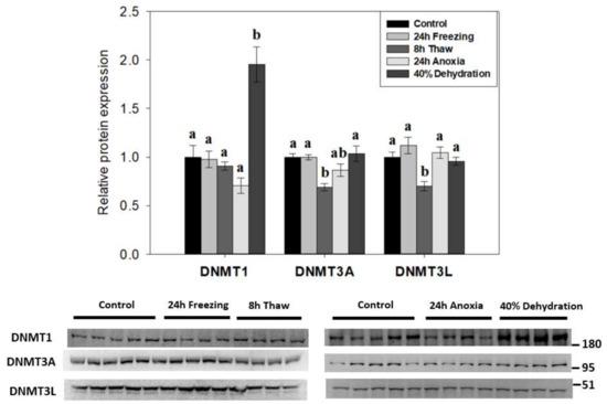 Effects of 24 h freezing, 8 h thaw, 24 h anoxia, and 40% dehydration on total protein levels of DNA methyltransferases DNMT1, DNMT3A, and DNMT3L in brain tissue of Rana sylvatica as determined by Western immunoblotting. Representative immunoblots are also shown, included with the approximate location of the closest molecular marker. DNMT3B antibodies did not cross-react strongly with protein homogenates in the target range. Data are mean ± SEM, on n = 4–5 independent trials on tissue samples from different animals. Values labeled with different letters (a, b) are significantly different from one another (p < 0.05). DNMT3A is n = 5 for frozen samples, while other targets are n = 4.