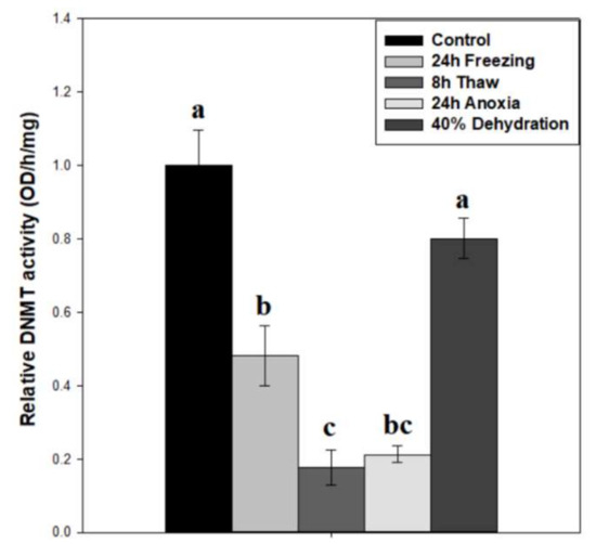2.2. Noticeable Depression in DNA Methyltransferase Activity during Freezing, Freeze Recovery, and Anoxia