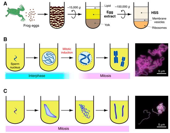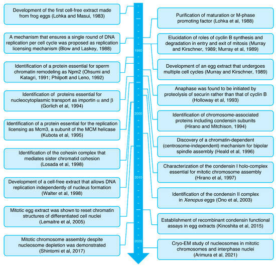 Cell-free extracts made from frog eggs were first described for studying the large-scale transformations of chromatin structures by Yoshio Masui in 1983 []. This pioneering work demonstrated that the cytoplasmic extract was readily prepared from eggs of the northern leopard frog Rana pipiens by centrifugation (Figure 1A) and that interphase nuclei and mitotic chromosomes can be assembled in a test tube, by incubating sperm nuclei of the African clawed frog Xenopus laevis in the Rana egg extract (Figure 1B). A year later, a similar cell-free system using egg extracts and sperm nuclei of the toad Bufo japonicus was also reported []. Subsequent works have developed protocols for the extract preparation from Xenopus eggs (instead of Rana or Bufo eggs) and for precise manipulation of the cell cycle stages in an extract [,,,]. Thus, frog egg extracts have broadened our understanding of the basic mechanism of cell cycle regulation. In parallel, the application of egg extracts has gradually been extended to biochemical studies on cell cycle-regulated chromosomal events such as DNA replication in S phase and chromosome assembly and segregation in mitosis. One of the most powerful protocols in this experimental system is the depletion of a target protein from egg extracts with its specific antibody (immunodepletion). This sharply addresses the requirement of a given protein for the corresponding cellular process. It is also possible to replace an endogenous protein with a recombinant protein (e.g., a protein with site-directed mutants) and investigate the functionality of the recombinant one in the extract []. Furthermore, proteins that mediate various biological processes can be purified from an egg extract by conventional column chromatography []. In this way, many scientists who have used frog egg extracts benefited from their unique biochemical tractability and produced many historically important results in cell biology [,,,,,,,,,,,,,,,,,,,] (Figure 2).