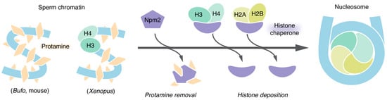 A series of these events, hereafter referred to as “sperm chromatin remodeling”, had been studied mainly by descriptive approaches such as light and electron microscopy until the early 1980s []. However, this situation drastically changed after the establishment of frog egg extracts by which the whole process of sperm chromatin remodeling can be recapitulated in a test tube. An outline of the cell-free assay is as follows. First, sperm nuclei isolated from testes of male frogs are treated with natural lecithins or non-ionic detergents to permeabilize their plasma and nuclear membranes. Next, the resultant “demenbranated” sperm nuclei are incubated in an egg extract at a temperature of around 20 °C. Consequently, sperm chromatin remodeling is completed within several minutes [,,,]. This indicates that activities sufficient for remodeling reside in egg extract. A protein responsible for both chromatin swelling and protamine removal was first identified as nucleoplasmin (currently referred to as Npm2) via fractionation of a Bufo egg extract []. A requirement of Npm2 for these events was confirmed by its immunodepletion from Xenopus egg extracts [] (Figure 3).