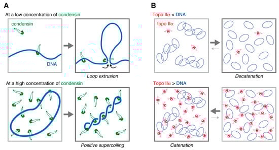 Our recent results, which were obtained from a combination of chromatid reconstitution assays and enzymological assays, strongly suggested that topo IIα first resolves inter-chromatid entanglements to drive chromatid individualization and then generates intra-chromatid entanglements to promote chromatid thickening []. Only the latter process requires the C-terminal domain (CTD) of topo IIα, which is known to be required for its chromosomal binding []. Consistently, topo IIα catalyzes different reactions on circular DNA (i.e., decatenation and catenation) depending on molecular crowding in the ambient environment (Figure 5B). Analogous to this, condensin I also differently acts depending on its concentration: it creates DNA loops at a relatively low concentration [], whereas positive supercoiling requires a considerably high concentration of condensin I [] (Figure 5A). In the future, it will be important to understand how DNA and chromatin structures are transformed by the cooperative actions of topo IIα and condensins in the crowded environment that were naturally created around the axis of each chromatid.