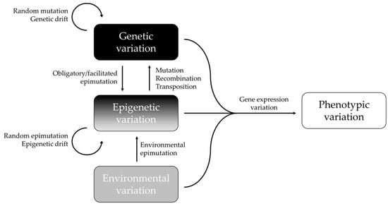 Interactions between epigenetic, genetic, environmental, and phenotypic variations. Epigenetic variation can depend upon the genotype (obligatory and facilitated epimutations), or it can be independent of the genotype (pure epimutations) and be generated by environmental changes or stochastic events (random epimutation/epigenetic drift). Adapted with permission from [47], 2022, Frédéric Silvestre.