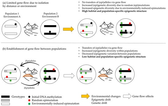 Epigenetic dynamics: ecological and geographical processes and their consequences on (epi)genetic diversity within populations and on (epi)genetic variation between populations. (a) Isolation by distance or by environment limits (epi)alleles transfer by gene flow. Stochastic events such as drift and (epi)mutations increase (epi)genetic diversity within populations over time. Environmentally induced epimutations create habitat and/or population-specific DNA methylation patterns that may be transmitted to the next generation, resulting in strong epigenetic structures. (b) As consequences of gene flow, (epi)genetic diversity increases within populations and (epi)genetic variation between populations decreases, thereby resulting in lower epigenetic structure that distinguished populations.