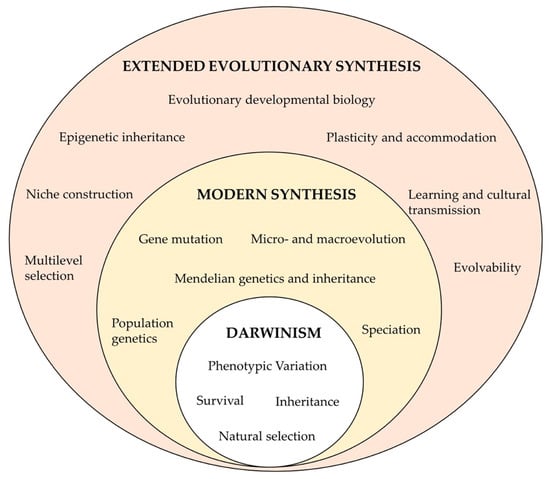 Schematic representation of key concepts included in the Extended Synthesis, illustrating the continuous expansion of evolutionary theories. Adapted with permission from [120], 2022, Massimo Pigliucci.