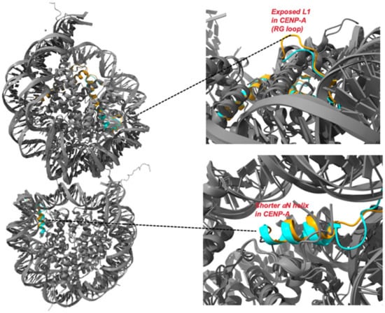 - CENP-A αN helix is one-turn shorter compared to that of H3 (Figure 2) at the nucleosome entry and exit sites; as a result, there are fewer DNA interactions: ~13 bp DNA segment is detached from the histone surface at both ends [41]. This leads to an increase in the flexibility of the DNA ends and this phenomenon is independent of the DNA sequence [41,42,43]. Additionally, it has been shown that the N-terminal tail of CENP-A, but not H3, promotes this DNA unwrapping [42]. CENP-A nucleosomes wrap only about ~120 bp of DNA [41,42] as compared to the 147 bp wrapped by the canonical nucleosomes [43]. This observation is further supported by the crystal structure of a heterotypic nucleosome reconstituted using H3.3 and CENP-A in which the DNA at the CENP-A side has much greater flexibility, while DNA is firmly wrapped on the H3 side [44]. Increased dynamics of the DNA ends have been observed for CENP-A nucleosome in vivo in ChIP-seq experiments [45]. Thus, the presence of CENP-A leads to an alteration in the DNA dynamics in the nucleosome, which results in unique centromeric chromatin structures. For instance, studies on nucleosomes assembled on longer DNA demonstrate that the flexible DNA at the entry/exit locations causes an alternative path for the linker DNA that does not pass over the dyad. Hence, the CENP-A nucleosome is incompatible with linker histone H1 binding [46,47]. In fact, the exclusion of H1 may be required to promote binding with the CCAN components to mediate KT assembly. This claim is supported by studies that show that deletion of the flexible DNA ends in CENP-A nucleosome impairs CCAN binding [47,48]. Interestingly, mechanical measurements have recently demonstrated that the CENP-A nucleosomes are more elastic than H3 nucleosomes [49]. Further, high-speed Atomic Force Microscopy (AFM) showed that the frequency of local DNA unwrapping events is higher in CENP-A nucleosomes as compared to canonical ones [50]. Thus, we can speculate that increased DNA flexibility may lead to increased core dynamics in the CENP-A nucleosomes. The increased flexibility of DNA in the CENP-A nucleosome also results in an increased structural heterogeneity [41]. It is known that structural heterogeneity aids in binding to numerous proteins to mediate complex signalling and multiprotein assemblies [51]. While it has been shown that this flexibility is required for centromere function [47], much is still unknown and is a topic of research.