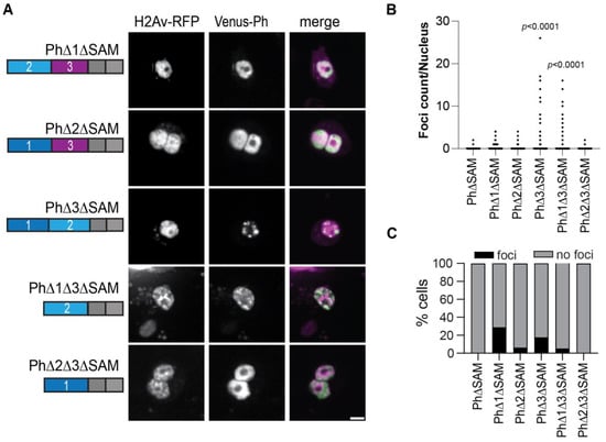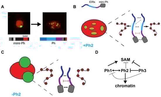 2.6. Removal of the Ph3 IDR Allows Ph2-Dependent but SAM-Independent Condensates to Form