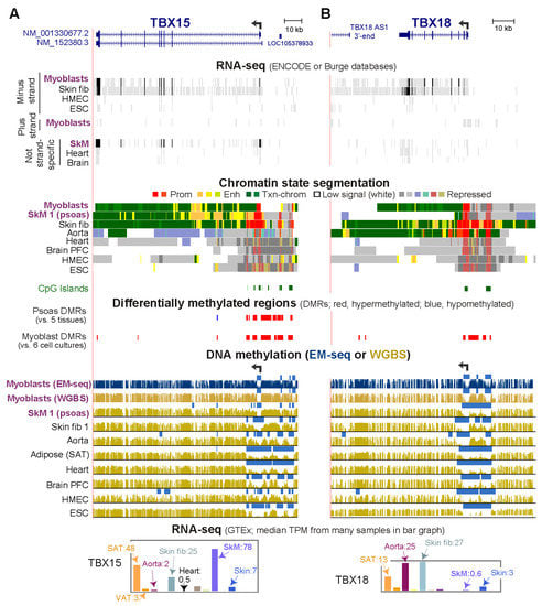 DNA hypermethylation in myoblasts borders the active, unmethylated promoter regions of TBX15 and TBX18. (A) TBX15 (chr1: 119,423,765–119,554,608) and (B) TBX18 RefSeq gene structures (chr6: 85,410,477–85,505,693). Strand-specific RNA-seq for myoblasts, foreskin fibroblasts (Fib, Fib 3), mammary epithelial cells (HMEC), and H1 embryonic stem cells (ESC) and not strand-specific RNA-seq for skeletal muscle (SkM), heart and brain. Color-coded chromatin state segmentation indicates promoter or mixed promoter/enhancer (prom), enhancer (enh), or repressed types of chromatin, actively transcribed chromatin (txn chrom), or chromatin with little or no signal for H3K27ac, H3K27me3, and H3K4/H3K9 methylation. Significant tissue-specific (SkM, psoas) DMRs and cultured cell-type specific (myoblast) DMRs are shown. Methylome profiles are depicted in gold for WGBS and, in dark blue, for EM-seq; regions having significantly lower methylation relative to the same genome [] are shown by light blue bars. Myoblast 3 cell strain was used for EM-seq and WGBS and Skin fib 1 (foreskin fibroblasts) for WGBS. GTEx RNA-seq expression profiles are displayed as linear-scale TPM bar graphs with some of the median TPM values from biological replicates indicated. SAT, subcutaneous adipose; VAT, visceral adipose; heart, left ventricle. All tracks are from the UCSC Genome Browser (hg19) and, except for the GTEx bar graphs, are aligned.