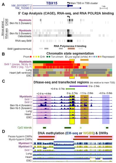 The myoblast-hypermethylated DMRs adjacent to the unmethylated TBX15 promoter region overlap psoas-hypermethylated DMRs. (A) The 5′ end of TBX15 (chr1: 119,525,320–119,536,521) showing the minus-strand signal from 5′ cap analysis of gene expression (CAGE) and/or RNA-seq of myoblasts, foreskin fibroblasts, and osteoblasts; not strand-specific RNA-seq for SkM of unknown body location (SkM 9); and the gastrocnemius muscle ChIP-seq signal for the large subunit of RNA polymerase II (ENCODE 3). (B) Chromatin state segmentation as in Figure 1. (C) DNaseI hypersensitivity profiles and the six cloned regions for transfection assays shown by horizontal bars or vertical shading. (D) Hypermethylated DMRs for SkM (psoas) vs. five heterologous tissues and for myoblasts vs. six varied cell cultures as well as methylome profiles and low methylated regions (light blue bars) as in Figure 1.