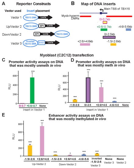 2.2. DNA Sequences That Were Part of Myoblast Hypermethylated DMRs near the TBX15 Promoter Region Display Promoter or Enhancer Activity upon Transfection into Myoblasts