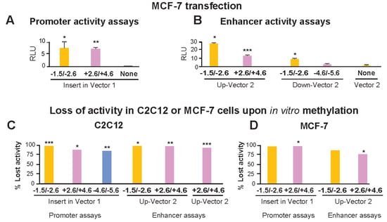 The promoter or enhancer activity of DMRs from the 5′ end of TBX15 was strongly decreased by targeted in vitro methylation or transfection into MCF-7 cells instead of myoblasts. Transfection was done with promoter-assay (A) or enhancer-assay (B) constructs as in Figure 3 but with the MCF-7 breast carcinoma cell line instead of C2C12 myoblasts as the host cells. Note the very different scales for normalized luciferase activity in Figure 3 vs. Figure 4. The normalized luciferase activity lost in C2C12 myoblasts (C) or MCF-7 cells (D) transfected with in vitro methylated compared with mock-methylated reporter gene constructs. The difference between methylated and unmethylated DNA was significant at p < 0.05 (*), p < 0.01 (**) or p < 0.001 (***). In vitro CpG methylation was targeted only to the insert.
