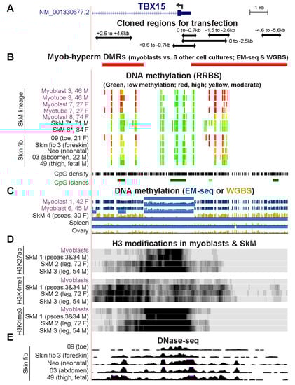 Some sample-specific differences in epigenetic profiles at the 5′ end of TBX15. (A) Positions of cloned regions used for transfection (chr1: 119,525,320–119,536,521; only the RefSeq Select isoform is shown). (B) WGBS- and EM-seq determined DMRs, RRBS profiles of DNA methylation, CpG density, and CpG islands. For RRBS tracks, only CpGs with ≥5 reads are shown. (C) EM-seq and WGBS profiles of DNA methylation with light blue bars denoting low methylated regions as in Figure 1. (D) H3K27ac, H3K4me1, and H3K4me3 signal and (E) DNaseI hypersensitivity for the indicated samples with vertical viewing ranges of 0–20, 0–10, 0–20, and 0–30, respectively. The ages and genders of donors of myoblast, SkM, and skin fibroblast samples are given, where known; Neo, neonatal skin fibroblasts were not further identified []; *, SkM from an unspecified body region.