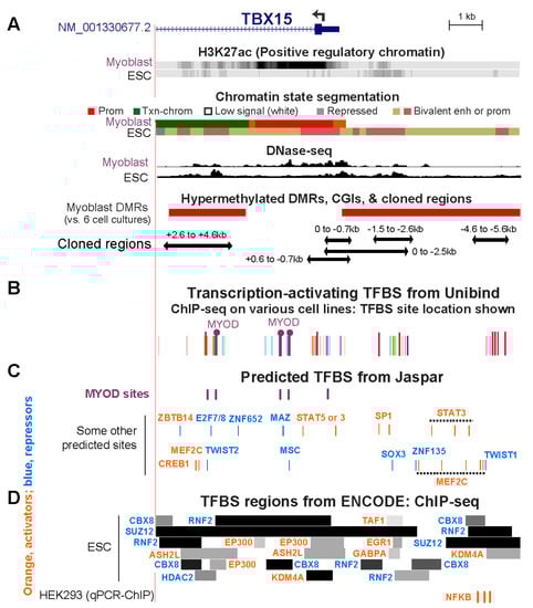Given that myoblasts have only been used to test genome-wide binding of a very small number of TFs, we also looked for predicted TF binding sites in the cloned regions of TBX15 from available data for other cell types. Many TFBS were predicted to have binding sites in the Myob-hyperm DMR regions and the promoter region in 5′ end of TBX15 (Figure 6C, JASPAR database []). There were two predicted additional binding sites for MYOD in the +2.6/+4.6 DMR region, for which in vivo binding was not seen, as well as multiple sites for STAT3 and MEF2C. In the ChIP-seq Unibind database, binding of various other transcription-stimulatory TFs was seen in the TSS-upstream and TSS-downstream Myob-hyperm DMRs in profiled human cancer cell lines, and endothelial cell cultures, and ESC (Figure 6B; Table S4; Unibind database [,]), in which TBX15 is repressed (Figure 1A). (Table S4). The lack of expression of TBX15 in ESC can be attributed in part to the stronger binding of repressive than of transcription-stimulatory proteins at the 5′ end of TBX15 as seen in the ENCODE database for human ChIP-seq (Figure 6D) and to the related finding of bivalent chromatin in ESC throughout the 5′ end of TBX15 (Figure 6A,D).