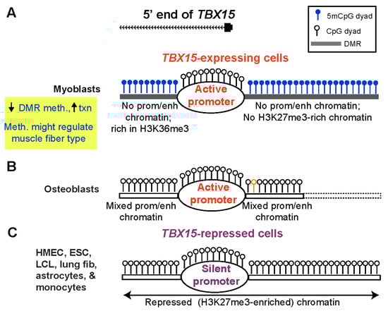 Cells not transcribing TBX15 would, by definition, have no need of fine-tuning TBX15 expression (Figure 7C). The extensive cross-talk between DNA methylation and chromatin epigenetics [] can help explain the different DNA methylation profiles near the TBX15 promoter in non-expressing cells vs. in myoblasts. Two caveats are that genome-wide epigenetic associations can miss important context-dependent exceptions and lesser-studied histone modifications can influence changes in DNA methylation []. Cell cultures with a silent TBX15 gene, such as HMEC, ESC, and lung fibroblasts, had H3K27me3 (often as bivalent chromatin) at the constitutively unmethylated core promoter and surrounding regions (Figure 7C). High levels of this repressive histone modification suffice to silence promoters. H3K27me3 enrichment displays a genome-wide association with low DNA methylation levels, but this anti-correlation is much weaker than that of H3K4 methylation and low DNA methylation [,]. As expected, the H3K4 methylation-rich chromatin present at the upstream and downstream DMRs adjacent to the TBX15 promoter in osteoblasts (Figure 7B) is negatively associated with local DNA methylation. However, in this case, the unmethylated DNA sequences can help upregulate TBX15 transcription as part of enhancers or an extended promoter []. The H3K36 trimethylation at the Myob-hyperm DMR immediately downstream of the promoter in myoblasts (Figure 7A) weakly favors DNA methylation [], as might the loss of H3K27me3 from the promoter-upstream Myob-hyperm DMR (Figure 7A). We propose that the use of DNA hypermethylation in myoblasts to suppress enhancer-like chromatin adjacent to the TBX15 promoter in myoblasts allows moderate downmodulation of TBX15 expression without causing excessive transcription repression as might result from deposition of H3K27me3 in the promoter-upstream or downstream regions.