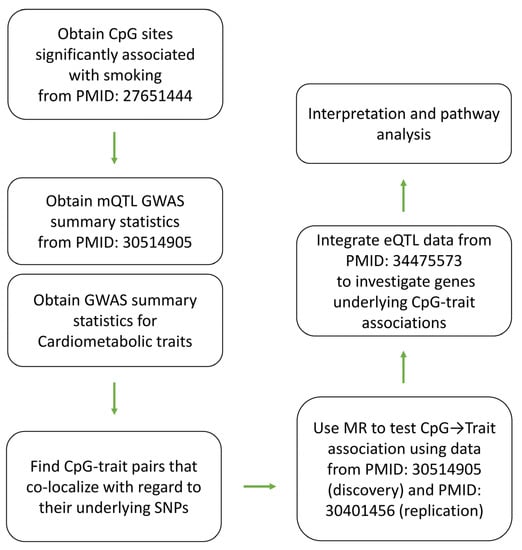 Previously, Joehanes et al. [] conducted a meta-analysis of genome-wide DNA methylation using DNA samples derived from the blood of 9389 participants (2433 current smokers and 6956 never smokers). The authors identified 2623 CpG sites that showed differential levels of methylation in current smokers vs. never-smokers after the Bonferroni correction. In this study, I chose these sites and examined their contribution to cardiometabolic traits through the analytical pipeline described in Figure 1.