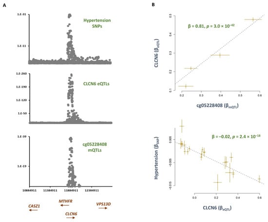 AGTRAP-PLOD1 is a well-established locus for hypertension [,]. Within this locus, I found cg05228408 becomes hypomethylated in smokers as compared to never-smokers (B = −0.01, p = 6.4 × 10−10, Table S3) and consequently, this increases the risk of hypertension (Table 1). Several genes are located within the AGTRAP-PLOD1 locus that are, to varying degrees, implicated in hypertension. By integrating the eQTL data, I noted GWAS signals for hypertension and cg05228408 overlap with eQTLs for CLCN6 (Figure 2). The outcome of the MR analysis was also consistent; namely, higher methylation at the cg05228408 site was associated with higher levels of CLCN6 (B = 0.81, p = 3.0 × 10−42, Figure 2), and consequently, this was associated with a lower risk of hypertension (B = −0.02, p = 2.4 × 10−18, Figure 2). CLCN6 encodes a protein that acts as a voltage-dependent chloride channel; this protein is primarily localized to late endosomes and functions as a chloride/proton antiporter.