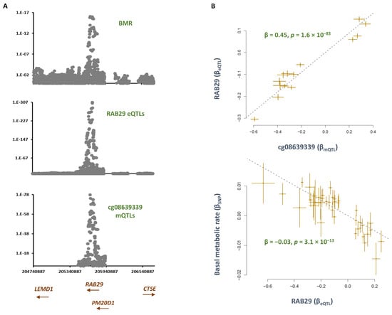 Co-localization analysis revealed mQTLs for cg08639339 overlap with SNPs, contributing to basal metabolic rate (PSMR = 1.1 × 10−11, PHEIDI = 0.07, Table S1). The top SNP in this region, rs6673687-T, was associated with a higher basal metabolic rate (B = 0.01, p = 3.2 × 10−13) but lower methylation at cg08639339 (B = −0.60, p = 1.5 × 10−78, Table S1). Consistently, the MR analysis revealed that higher methylation at this site contributes to a lower basal metabolic rate (B = −0.2, p = 3.6 × 10−10, Table 1). By investigating the eQTL data, I noted eQTLs for RAB29 overlap with mQTLs for cg08639339 and GWAS signals for basal metabolic rate (BMR) (Figure 2). MR analysis revealed higher methylation at the cg08639339 site contributed to a higher expression of RAB29 (B = 0.4, p = 1.6 × 10−83), and this lowered BMR (B = −0.03, p = 3.1 × 10−13, Figure 3). RAB29, formerly known as RAB7L1, encodes a protein that is involved in lysosomal trafficking and maintenance.