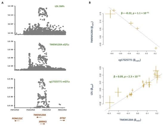 The methylation site cg17325771 was hypomethylated (B = −0.01, p = 6.5 × 10−11) in smokers compared to non-smokers. Co-localization analysis revealed mQTLs for cg17325771 overlap with SNPs contributing to LDL (PSMR = 3.4 × 10−14, PHEIDI = 0.013, Table S1). Subsequently, MR analysis revealed lower methylation at this site contributes to higher LDL levels (B = −0.03, p = 6.9 × 10−14, Table 1). By plotting the distribution of eQTLs, I found TMEM120A to be the likely gene that mediates the impact of cg1732577 on LDL (Figure 4). The outcome of the MR analysis also revealed lower methylation at the cg17325771 site is associated with higher expression of TMEM120A (B = −0.22, p = 1.1 × 10−31), and this consequently contributes to higher LDL level (B = 0.09, p = 2.3 × 10−15, Figure 4). The protein encoded by TMEM120A is a transmembrane protein induced by the tumor necrosis factor-alpha (TNF-α).