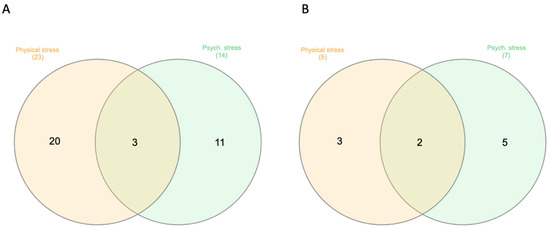 Venn diagram of the number of differentially methylated CpG sites before FDR adjustment in Physically and Psychologically stressed women relative to healthy women at T1 (A) and T2 (B).