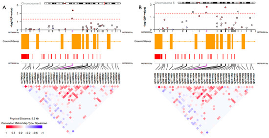 Representative regional plots illustrating part of NR3C1 gene and investigated CpGs, highlighting the differentially methylated sites in psychologically (A) and physically (B) stressed women relative to healthy women, respectively, at Time 1. The upper panels present the log transformed p-values with red dotted line as the cutoff used (p ≤ 0.05). Below is the ENSEMBL track annotation and the correlation of methylation levels among all CpGs in this selected region.