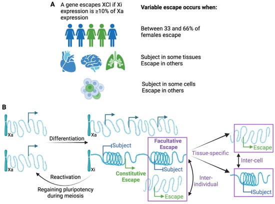As the number of studies and approaches have increased, so has the identification of variability, not only between individuals but between tissues and even cells within a population []. Adding to the variability between studies, standardized thresholds have not been adopted regarding how frequently a gene must differ from the more common XCI status call in order to call it variable. The first extensive study identifying variable escape genes used both somatic cell hybrids and allelic expression, and called variable escape when three to six of the nine Xi-containing hybrids showed significant expression, and thus, a threshold of 33–66% of samples is often used ([], see Figure 2A). Different thresholds might be appropriate for different studies, but it is important to know the underlying threshold when describing variability. In addition to being aware of the variability between studies, intrinsically variable genes may provide insights into the mechanisms underlying escape from XCI. As shown in Figure 2, while inter-individual differences likely are present from the time of XCI, tissue-specific escape from XCI may often reflect the reactivation of previously silenced genes. While XCI is an impressively stable epigenetic silencing event, reactivation, particularly in the concept of cancer or aging, could contribute to sex differences.
