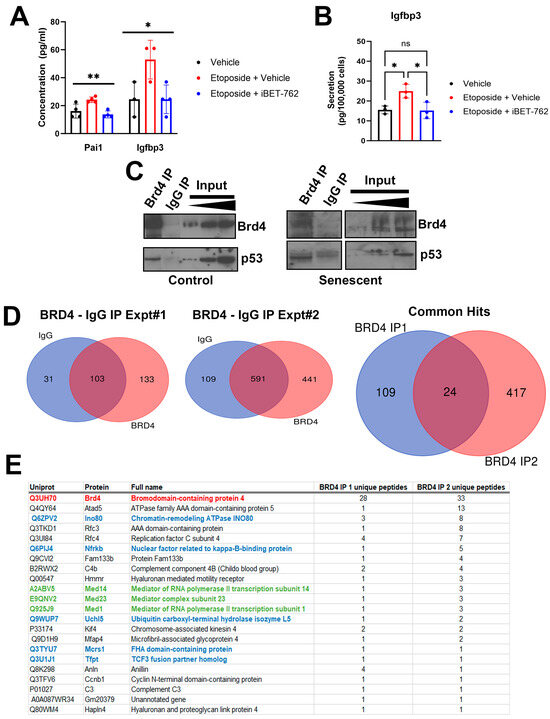 Regulation of SASP by BET proteins and identification of Brd4-associated proteins during senescence in NIT-1 cells. (A) Luminex assays measuring the concentration of SASP factors Pai1 and Igfbp3 in the 24 h conditioned media collected from NIT-1 cells control (vehicle, DMSO), or senescent cells (0.25 µM etoposide treatment) at 11 days post-etoposide washout. Following drug washout, cells were treated once with vehicle or iBET-762 (5 µM) until harvest. (B) A repeated experiment as in (A) except for assaying Igfpb3 secretion by normalizing the amount in the conditioned media to the viable cell counts at the end of the assay at day 7 post-etoposide washout. (C) Immunoprecipitation (IP) of Brd4 followed by Western blots for Brd4 and p53 from 100 µg of nuclear extract protein of control or senescent NIT-1 cells at day 6 post-etoposide treatment. Input is 3, 5, and 10 µg of nuclear extract and rabbit IgG was the species matched control IP. (D) Mass spectrometry was performed on IgG control and Brd4 IPs from senescent NIT-1 cell nuclear extracts in two independent experiments on senescent NIT-1 cells at day 6 post-etoposide treatment. The number of proteins identified uniquely or in common in the datasets are shown. Brd4 IP experiment 1 and 2 identified a total of 24 common accessions (22 different proteins). (E) Table listing the 22 different proteins in the Brd4 IP1 and IP2. Brd4 is highlighted in red, subunits of the Ino80 complex are in blue, and the Mediator complex is in green. ns, not significant, * p < 0.05, ** p < 0.005, one-way ANOVA.
