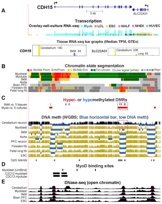 The 5′ end of CDH15, a cadherin gene expressed highly in both myoblasts and cerebellum, is hypomethylated in both cell populations. (A) The RefSeq isoform at chr16:89,230,125–89,270,723 (hg19). RNA-seq for cell cultures is depicted as the log transformed overlay signal and for 37 tissues as bar graphs with relative heights (linear scale) for median TPMs (GTEx; see Tables S1 and S2, for detailed data). Broken arrows depict the genes’ TSS and the direction of transcription. (B) Chromatin state segmentation (18-state; Roadmap Epigenomics Project) is based on key histone methylation and acetylation profiles. (C) DMRs and WGBS. In the DMR tracks, the purple dotted box indicates the cryptic promoter. For WGBS tracks, the blue bars are significantly low methylated regions (LMRs) relative to the whole genome for that sample. DMRs for SkM (psoas) vs. five other tissues (heart, aorta, lung, monocytes, and adipose tissue) and for myoblasts vs. six cell cultures (skin fibroblasts, lung fibroblasts, mammary epithelial cells, prostate epithelial cells, embryonic stem cells, and in vitro-generated adipocyte from mesenchymal stem cells) are shown. (D) CTCF and MyoD binding sites are from the UniBind ChIP-seq database or from human sequences homologous to C2C12 mouse DNA segments shown to bind MyoD upon ChIP-seq. (E) DNaseI hypersensitivity from ENCODE. Unless otherwise stated, all tracks are from the UCSC Genome Browser. Tracks are aligned except for the GTEx bar graphs. The dotted boxes in Panel C indicate the Myob-hyperm DMR described in the text. Abbreviations: Str, strong; Wk, weak; Prom, promoter; Enh, enhancer; Txn-chrom, chromatin with the H3K36me3 indicative of active transcription; Low signal, negligible signal for H3K27ac or me3, H3K4me1 or 3, H3K9me3, or H3K36me3; Repr, repressed; Myob, myoblasts; LCL, lymphoblastoid cell line (GM12848); ESC, human embryonic stem cells (H1); NHLF, lung fibroblasts; NHEK, normal human epidermal keratinocytes; HUVEC, human umbilical vein endothelial cells; SkM, skeletal muscle (psoas) except for GTEx data, where it indicates gastrocnemius SkM; PFC, pre-frontal cortex; fib, fibroblast; HMEC, human mammary epithelial cells.