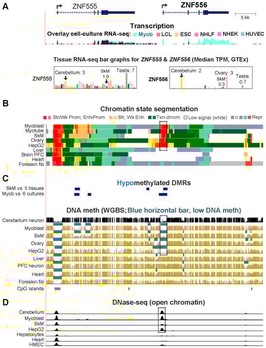 Of the 20 Myob/Cbl genes, ZNF556 (zinc finger protein 556) has the strongest specificity for expression in myoblasts (Table 1). It is a very little studied gene that encodes a protein which contains C2H2 zinc finger domains and a KRAB domain, as seen in many ZNF transcription factors (TFs). ZNF556 is also specifically expressed in cerebellum, ovaries, HepG2 (liver cancer cell line), and testes (Figure 2A and Figure 3A, top). It has lower expression in SkM than in myoblasts, which suggests that its main function is in differentiation. Only ZNF556-expressing cell types and tissues displayed promoter chromatin and low DNA methylation both upstream and downstream of the gene’s TSS (Figure 2B,C and Figure 3A). In addition, only expressing samples had a prominent DNase-seq peak in this region, which was seen immediately upstream of the TSS (Figure 2D and Figure 3A).