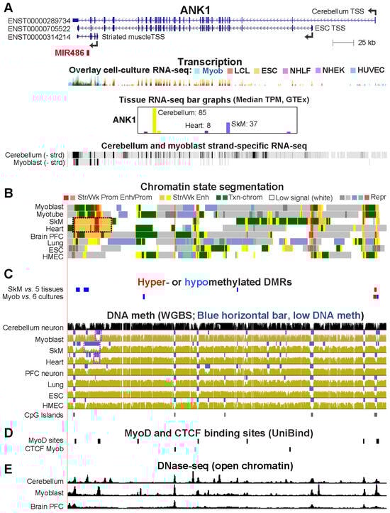 ANK1 (ankyrin 1) codes for a protein that links integral membrane proteins to the cytoskeleton and is involved in cell motility, proliferation, and the maintenance of specialized membrane domains [34]. It is very highly expressed in erythroblasts and preferentially transcribed in cerebellum, SkM, and, to a lesser extent, heart (Figure 6A) [26,34]. It has many tissue-specific RNA isoforms (see Figure 6A for several of them) involving alternative promoter usage as well as alternative splicing. SkM [35], myoblasts, and heart transcribe predominantly one of the shortest isoforms (ENST00000314214) while cerebellum transcribes predominantly one of the longest isoforms (ENST00000289734, Figure 6A and GTEx isoform expression profiles [16]). Myoblasts express this gene at the highest levels compared to 17 other non-transformed cell cultures in the ENCODE database (Figure 6A). Some cell cultures unrelated to the muscle lineage express ANK1 at moderate levels, e.g., ESC, bone marrow stem/stromal cells, and osteoblasts. However, these cell cultures do not use myoblasts’ proximal promoter, as indicated by 5′ cap analysis gene expression (CAGE) [36] of cell cultures. The 5′ ends of the large ANK1 isoforms can be difficult to ascertain. For example, CAGE profiles show that ESC primarily use the promoter of the ANK1 isoform ENST00000705522. GTEx indicates that cerebellum predominantly initiates transcription at a more distal promoter although this is not clear from RNA-seq profiles (Figure 6A). In the last intron of all the ANK1 isoforms, MIR486 is found. It encodes miR-486, a miRNA that is essential for myoblast proliferation and differentiation, normal myogenesis, and normal SkM and heart formation [37].
