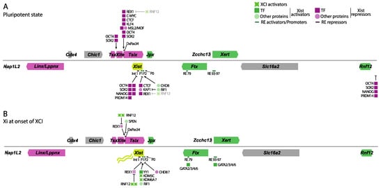 Overview of the different proteins, REs, lncRNAs, some local chromatin modifications, and topological organization of the Xic. Same legend as in Figure 2, plus the role of the different lncRNAs on Xist expression, the presence of different activating or repressing histone marks, and the bipartite TAD structure of the Xic. (A) In pluripotency, Tsix represses Xist thanks to transcription running through its gene body. Tsx seems to prop up Xite and Tsix expression, while Linx/Lppnx seem to have a role on Xist expression directly or through its RNA molecule at the level of OCT4 and REX1 displacement from the Xist locus. The Xic presents a bipartite TAD structure separated by a region at the 3′ end of Xist known as RS14. Expression of Tsix deposits the heterochromatic and euchromatic histone PTMs H3K36me3 and H3K4me2 across the Tsix/Xist gene body as well as the P1 and P2 promoters of Xist, maintaining the promoter regions in a poised state. Other histone heterochromatic PTMs found at the P1 and P2 promoters of Xist in pluripotency are H3K9me2, H3K9me3, H3K27me1, and H4K20me2. Repression of known Xist lncRNA activators is achieved by extended deposition of the heterochromatic mark H3K27me3 across the Xist TAD, while expression of known Tsix lncRNA activators is maintained by enrichment of the histone euchromatic marks H3K4me3 and H3K27ac. The Tsix TAD is depicted by the pink triangle, while the Xist TAD is depicted by the green triangle. When the lncRNA gene acts on Tsix or Xist through its lncRNA molecule, the lncRNA symbol has been added. (B) At the onset of XCI, in the future Xi, Ftx and Xert will help in Xist upregulation through either transcription running through their gene bodies (Ftx) or through RE at their promoters (Xert), while the mechanism of action of Jpx through its RNA molecule is debated. Loss of Tsix expression results in the enrichment of the histone euchromatic marks H3K4me2, H3K4me3, and H3K27ac at the Xist P1 and P2 promoters. Tsix downregulation is then maintained by the removal of the euchromatic mark H3K27ac and vague deposition of H3K27me3 at its promoter. Upregulation of known Xist lncRNA activators is achieved by depletion of the H3K27me3 hotspot within the Xist TAD and subsequent increase in the histone euchromatic PTMs H3K27ac and H3K4me3 at the lncRNA promoters. Subsequently, the downregulation of Tsix lncRNA activators is maintained by the deposition of H3K27me3. Finally, the bipartite TAD structure of the Xic is lost (grey). Shades of magenta show Xist repressors, while shades of green indicate Xist activators and XCI activators. When the lncRNA gene acts on Tsix or Xist through its lncRNA molecule, the lncRNA symbol has been added.