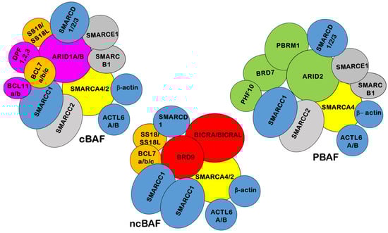 SWI/SNF chromatin-remodeling enzymes are multi-subunit complexes, conserved across different eukaryotes, including fungi, plants, and animals [1]. Mammalian SWI/SNF is composed of a central catalytic subunit with ATPase activity that is either SMARCA4 (BRG1) or SMARCA2 (BRM) and 8–15 associated subunits (BAFs) [2]. Distinct SWI/SNF complexes have been purified from mammalian cells and designated as canonical (c)BAF, non-canonical (nc) BAF, or PBAF depending on the identity of the catalytic subunit and BAF composition [3,4,5,6,7,8,9] (Figure 1). In addition, mammalian complexes can vary in composition and in a cell-specific manner [10,11].