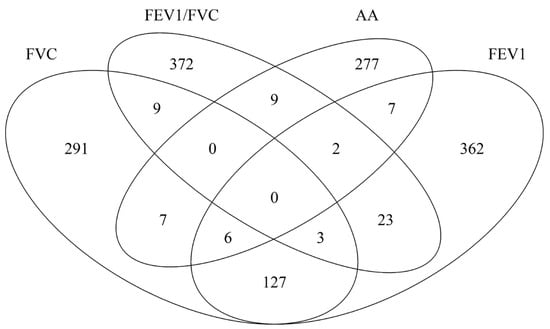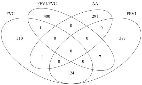 Overlap of identified CpGs which DNA methylation at birth are associated with asthma acquisition (AA), and lung function measures including FEV1, FVC, and FEV1/FVC ratio.
