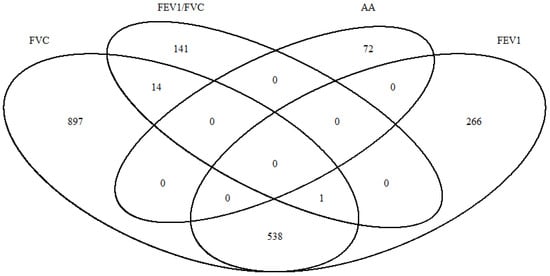 We then independently examined each of the 551,710 CpG on its association in DNAm with lung function at age 10 years. In total, 436 CpG sites were identified for FVC, 514 for FEV1, and 408 for FEV1/FVC. The number of CpGs overlapped between FVC and FEV1 124 common CpGs (Figure 1 and Supplementary File S1). No CpGs were common across all the three types of lung function measurements. For the CpGs identified for the three lung function parameters, only one showed statistically significant association with asthma acquisition, cg23642632. This CpG is on the gene of NCKAP1. Since one CpG site can possibly regulate the functionality of more than one gene, for the Identified CpGs, we further assessed their mapped genes common between different lung function parameters and between lung function and asthma acquisition (Figure 2). The largest overlap is still between FVC and FEV1 (136 common genes) and 39 genes common between at least one of the three lung function parameters and asthma (Supplementary File S1).