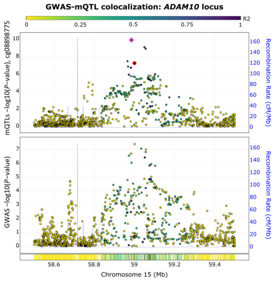 GWAS−mQTL colocalization pair in the ADAM10 locus. The colocalization of AD GWAS signals and methylation QTL (mQTL) signals are shown for the CpG site cg08898775 at SNP rs347117 of chromosome 15. The pink square highlights the lead SNP in this locus, while the colocalized SNP is highlighted by a red dot.