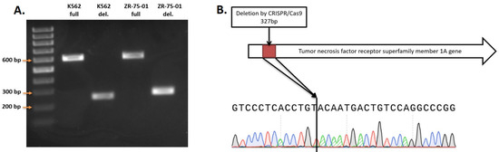 (A) PCR screening of TNFRSF1A gene deletion. (B) Sample of sequence of TNFRSF1A deletion in ZR-75-01 TNFRSF1A-\-9C9 cells.