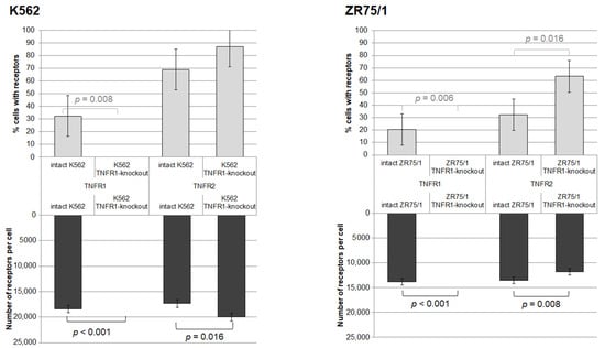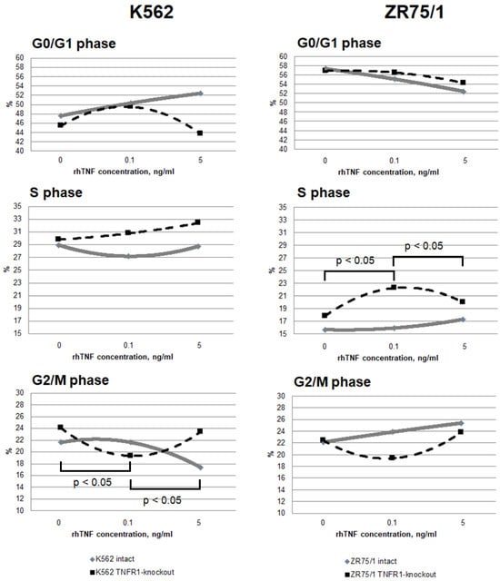 Our previous studies used cell lines of various origins, in which it was shown that ZR75 and K562 have stable high expression of receptors for TNFR1 and TNFR2, while stimulation of these cell lines with various doses of TNF led to multidirectional changes in receptor expression, as well as changes in the functional response, manifested in the form of changes in apoptosis and the cell cycle [14]. Also, the determining factor was the production of stable clones with TNFR1 knockout specifically for these cell lines.