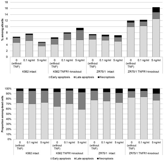 Dose-dependent effect of TNF cytokine on cell death parameters in intact and knockout cell lines. The cells were cultured for 72 h for K-562 and 96 h for ZR-75/1 in the absence and presence of recombinant human TNF at concentrations ranging from 0.01 to 5 ng/mL. The cells were stained using Annexin A5 apoptosis detection kit. Data are presented as the mean value. The number of replications is n ≥ 3 for each cell line.