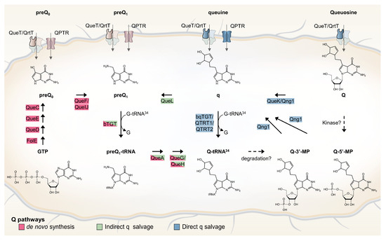 Bacterial Q de novo and salvage pathways. Q de novo synthesis pathway is depicted with enzymes that are shown in red. Indirect and direct q salvage pathways are depicted with enzymes that are shown in green and blue, respectively. Possible degradation and phosphorylation pathways are shown with dashed arrows. Among the four components of ECF transporters, only the substrate-specific transmembrane (S) component (QueT/QrtT) is labeled (bold border).