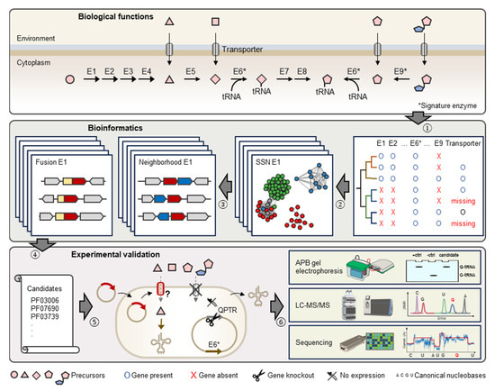 Schematic representation of comparative genomics-driven approach to identify novel Q transporters. (1) Identification of knowledge gaps in metabolic pathways, e.g., missing Q precursor transporters. (2) Construction of Sequence Similarity Networks (or SSNs) for signature enzymes in Q pathways, e.g., E6 (TGT) and E9 (Qng1/QueK). (3) Investigation of genomic neighbors and fusions for Pfam families of query signature enzyme. (4) Generation of candidates. (5) Expression of candidates in engineered E. coli strains lacking indigenous Q precursor transporter. (6) Detection, quantification, and localization of Q-tRNA using various technologies. Enzymes in Q biosynthesis pathway are represented by E1 to E9. Among them, E6 (TGT) and E9 (hydrolases) are signature enzymes of q salvage.