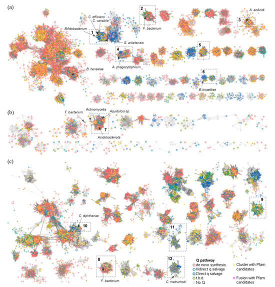 Previous reconstructions of Q pathways of the human microbiota used only de novo pathway genes and were restricted to a limited number of reference organisms [7,15]. To predict the importance of Q exchanges for different niches of the human microbiome, we analyzed the presence–absence patterns of all known Q synthesis and salvage genes in 13,027 genomes of the gut microbiome (Dataset S1) and 8547 genomes of the oral microbiome (Dataset S2).