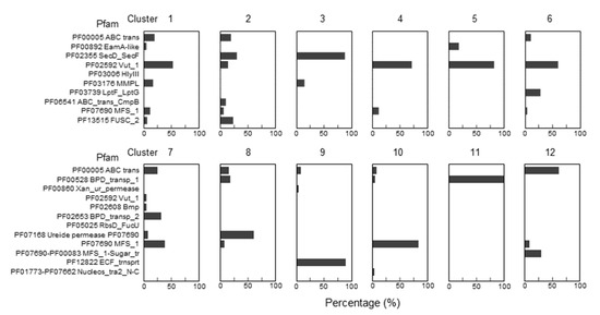 Enrichments of specific Pfam transporter families clustering with Q salvage genes. For each boxed cluster in Figure 6 (numbered 1 to 12), all transporter candidates present in each cluster (yellow nodes in the boxed cluster in Figure 6) were extracted and the percentage of candidate members of specific Pfam families was plotted for each cluster.