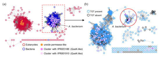 SSN of the ureide permease family (IPR009834/PF07168). (a) Each node in the network represents one ureide permease protein. An edge (represented as a line) is drawn between two nodes with a BLAST E-value cutoff of better than 10–30 (alignment score threshold of 30). Node boarders were colored by superkingdom. Members that share no less than 90% identity with curated ureide permeases in the Uniprot database are colored in orange. Nodes encoded by genes that cluster with queK-like genes are colored in pink. The UPS members connected to the preQ1 transporter in the Acidobacteriota bacterium (boxed) were further analyzed. (b) Each node in the network represents one UPS protein connected to the preQ1 transporter in the Acidobacteriota bacterium (A0A2V9U0M9) boxed in (a). An edge is drawn between two nodes with an alignment score better than 100. Node borders are colored by the presence (blue) or absence (black) of bTGT. The nodes in the red circle are predicted to be the preQ1 transporters.