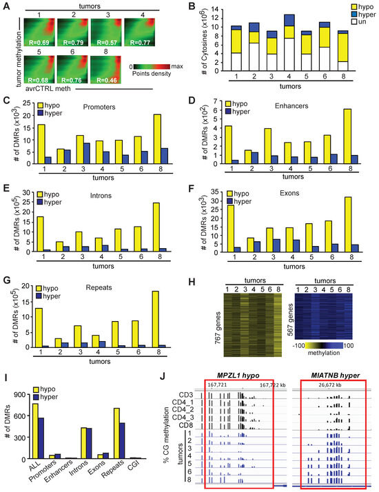 While tumors varied in the frequency of hypo- and hypermethylated DMRs in genomic elements, the trend remained similar within individual tumors. For example, the most hypomethylated tumors were T1 and T8, and hypomethylation was manifested across all genomic elements. Similarly, the ratio between hypo- and hypermethylated DMRs was the smallest in T2, and that trend was seen across all genomic elements (Figure 2C–G).