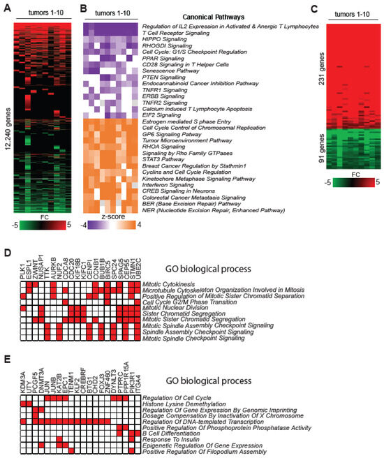 Gene expression signatures and deregulated pathways in PTCLs. (A) Heat map showing fold change expression values of a subset of differentially expressed genes (DEGs; FC ≥ 1.5, adjusted p < 0.05 by DESeq2) in human T–cell lymphomas (n = 10) relative to control T–cells (n = 4) as analyzed by RNA-seq. A scale is shown below the heat map, in which green and red correspond to a decrease and increase in expression, respectively. (B) Results of ingenuity pathway analysis (IPA) performed on all DEGs in individual tumors. The top 15 up- and downregulated canonical pathways that were most consistently deregulated in analyzed human lymphomas are shown. (C) ‘Core PTCL Gene Expression Signature’ consisting of 231 up- and 91 downregulated genes relative to the average of normal T–cells (n = 4) in all 10 tested lymphomas as determined by RNA-seq data analysis. (D) Pathway enrichment analysis of upregulated genes in the ‘Core PTCL Gene Expression Signature’ in the category GO Biological Process by EnrichR (p < 0.05). (E) Pathway enrichment analysis of downregulated genes in the ‘Core PTCL Gene Expression Signature’ in the category GO Biological Process by EnrichR (p < 0.05).