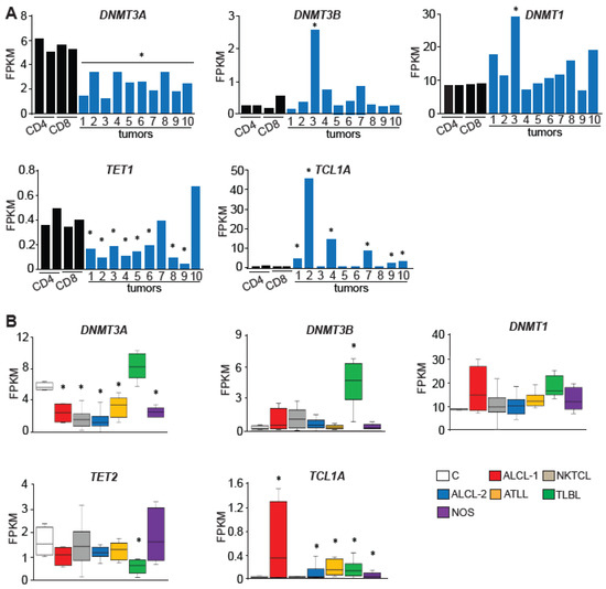 Expression of DNA methylation modifiers is deregulated in human PTCLs. (A) Expression of DNMT3A, DNMT3B, DNMT1, TET1, and TCL1A in human PTCLs and control T–cells as analyzed by RNA-seq. Statistical analysis was performed by comparison of individual tumors to average values obtained from control T–cells (n = 4). The statistically significant differences (p < 0.05 by DESeq2) are indicated by *. (B) DNMT3A, DNMT3B, DNMT1, TET2, and TCL1A expression as determined by RNA-seq analysis of normal human T–cells (C, n = 4), two sets of human anaplastic large cell lymphomas (ALCL-1, n = 5 tumors T1–T5 profiled in this study; ALCL-2, n = 21 publicly available data), NKTCL T–cell lymphoma lines (NKTCL, n = 15), adult T–cell leukemia/lymphomas (ATLL, n = 8), T-lymphoblastic lymphomas (TLBL, n = 8) and PTCL-NOS (n = 5, tumors T6-T10 profiled in this study). The horizontal line represents the median, bounds of the box-like range of variation, and whiskers min and max values. * p < 0.05 (by DESeq2).