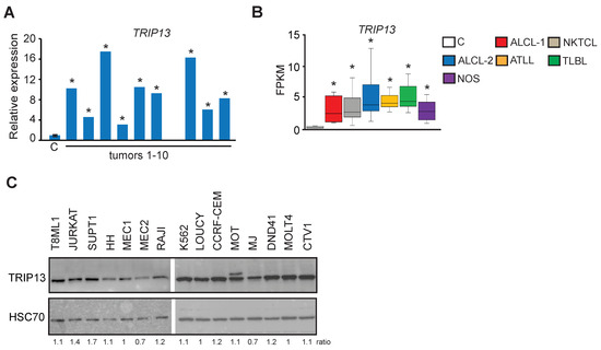 TRIP13 is frequently upregulated in primary human PTCL. (A) Relative TRIP13 expression as determined by RNA-seq. Data are presented as fold differences in FPKM values relative to the mean of normal T–cells (C; n = 4) obtained by RNA-seq analysis. Statistically significant differences are indicated by *. (B) TRIP13 expression as determined by RNA-seq analysis of normal human T–cells (C, n = 4), two sets of human anaplastic large cell lymphomas (ALCL-1, n = 5 tumors T1-T5 profiled in this study; ALCL-2, n = 21 publicly available data), natural killer T–cell lymphomas (NKTCL, n = 15), adult T–cell leukemia/lymphomas (ATLL, n = 8), T-lymphoblastic lymphomas (TLBL, n = 8) and PTCL-NOS (n = 5, tumors T6-T10 profiled in this study). The horizontal line represents the median, bounds of the box-like range of variation, and whiskers min and max values. Pairwise comparisons between each tumor group and controls are statistically significant (p < 0.05 by DESeq2) indicated by *. (C) Immunoblot analysis of TRIP13 protein levels in human lymphomas and leukemia cell lines. T8ML-1 (PTCL-NOS); JURKAT (acute T–cell leukemia); SUP-T1 (T–cell lymphoblastic lymphoma); HH (cutaneous T–cell leukemia/lymphoma), MEC1, MEC2 (chronic B-cell leukemia); RAJI (Burkitt’s lymphoma); K-562 (chronic myelogenous leukemia); LOUCY, CCRF-CEM (acute T–cell lymphoblastic leukemia); Mo T (hairy T–cell leukemia); MJ (cutaneous T–cell lymphoma); DND41 (acute T–cell lymphoblastic leukemia); MOLT4 (T lymphoblast cell); CTV-1 (T-ALL). HSC70 served as a loading control.