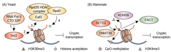 Histone proteins undergo various post-translational modifications, such as methylation of arginine (R), phosphorylation of serine (S) and threonine (T), and several other lysine (K) residue modifications, including acetylation (ac), methylation (me), ubiquitylation (ub), sumoylation, biotinylation, and ADP-ribosylation [5,6,7]. These modifications are important for regulating chromatin structure and its accessibility, determining whether chromatin is in an open or closed state. The formation of open chromatin at unintended or cryptic sites can lead to increased cryptic transcription, which is closely regulated by histone modifications [3,8]. Specifically, histone modifications associated with open chromatin, such as acetylation (e.g., H3K27ac) and certain methylations (e.g., H3K4me3), can inadvertently reveal cryptic transcription start sites [3]. These changes reduce nucleosome density and facilitate the binding of transcription factors and RNA polymerase (Pol), potentially resulting in cryptic transcription. Inversely, histone modifications can function as crucial factors in preventing cryptic transcription [3,8]. Therefore, this opinion provides an overview of the currently known pathways in which histone modifications occur to restrict cryptic transcription.